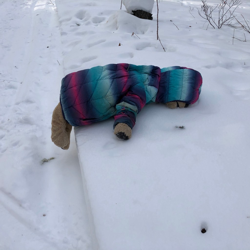 My dad went for a walk this morning and he said that he fell in the snow He took a picture of himself in the snow for me here it is.